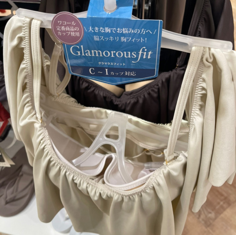 高橋が選んだ水着は、セパレートタイプで、上はフリルがついたシャツのようなデザインで、下はハイウエストです。名前は「グラマラスフィット」で、CからIサイズまで対応するというすごい商品です。