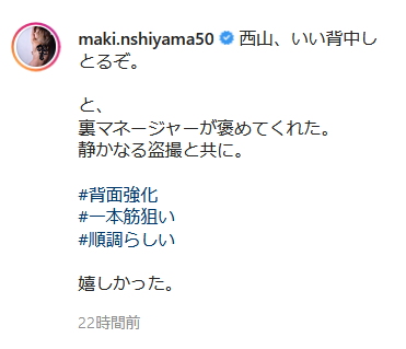 湯上りさながら頭にタオルを巻いた西山さんがラン〇ェリーのホックを留めようとする様子をとらえた写真をインスタグラムに投稿しました。“裏”マネージャーなる人物に背中を褒められたそうです。