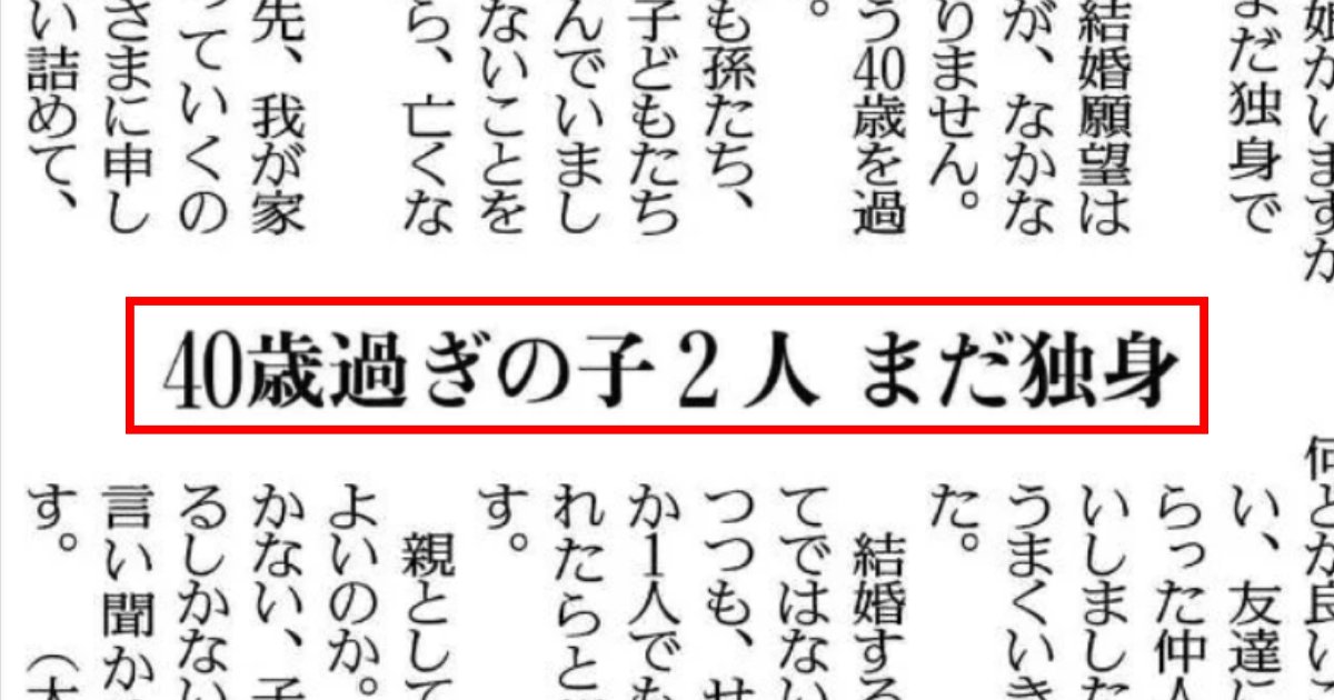 【全文あり】60代女性、家系が途絶えてしまう。ご先祖様に申し訳ない「まずは子離れから」「親なのに干渉しすぎ」