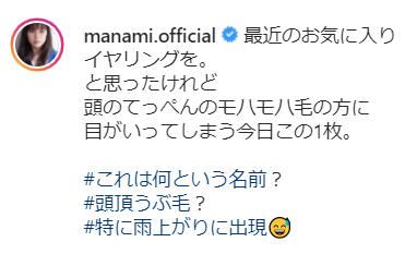 お気に入りのイヤリングを付けた写真を投稿。素敵なイヤリングですね。お似合いです。