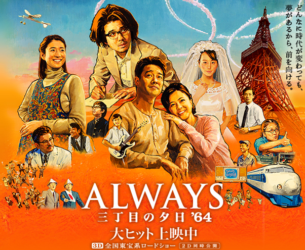 時は昭和30年、東京下町の夕日町三丁目で暮らす鈴木一家に、集団就職で上京してきた六子が住み込みで働き始めます。一方、向かいで駄菓子屋を営む茶川竜之介は、一杯飲み屋のおかみに預けられた身寄りのない少年・淳之介の面倒を見ることになるのですが・・。 山崎貴監督が得意のVFXを駆使して当時の風景を丁寧に再現し、興行収入は32.