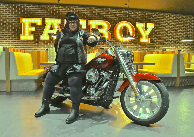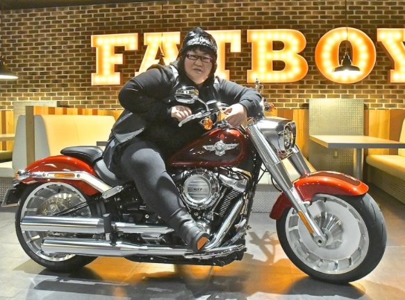 「峰不二子を意識して、フルオーダーで」と60万円のレザースーツ姿を披露した安藤さん。愛車であるハーレーダビッドソンの115周年記念モデル「ハーレーダビッドソン・ファットボーイ アニバーサリーモデル 1868cc」を紹介していました。