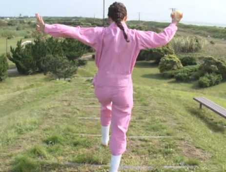 汚れても大丈夫なようにピンク色のつなぎを着ています。