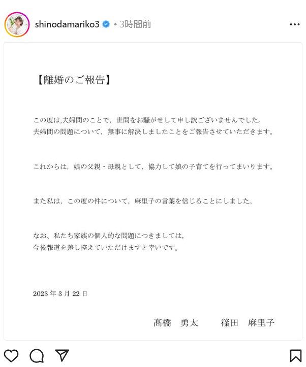 その後3ヶ月の時間を経て、この日「この度は、私たち夫婦間のことで、大変皆様にご心配をおかけいたしましたが、この度話し合いにより離婚することに合意し、夫婦間の問題が無事に解決しましたことをここにご報告させていただきます」とつづり、夫の高橋勇太氏との連名の書面も投稿したのでした。