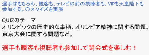 参考として貼り付けられているのは、日本テレビの人気番組『アメリカ横断ウルトラクイズ』の画像。○×クイズは東京五輪に関する質問で、全部で5問。例えば、以下のようなクイズが出される予定でした。