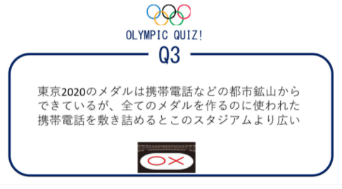 Q3 東京2020のメダルは携帯電話などの都市鉱山からできているが、全てのメダルを作るのに使われた携帯電話を敷き詰めるとこのスタジアムより広い。○か×か