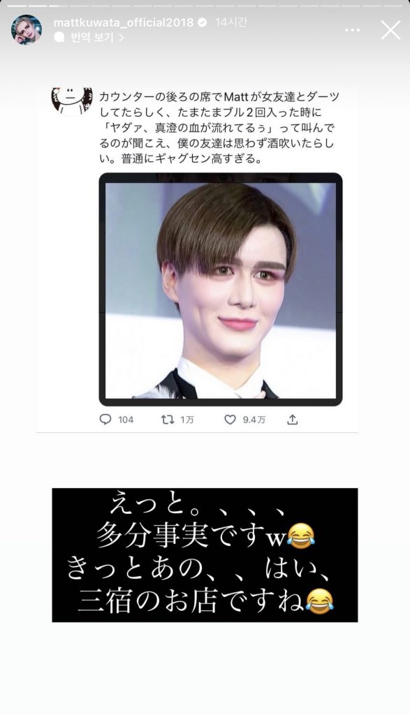 Mattさんは「これめちゃくちゃ友達からもきました えっと。、、、多分事実ですw きっとあの、、はい、三宿の店ですね」と投稿内容を認めました。このツイートは18日午後7時時点で同ツイートには11万以上のいいねがつくほどの大反響。「さすがにバズりすぎじゃない?」と驚きのストーリーも更新しました。