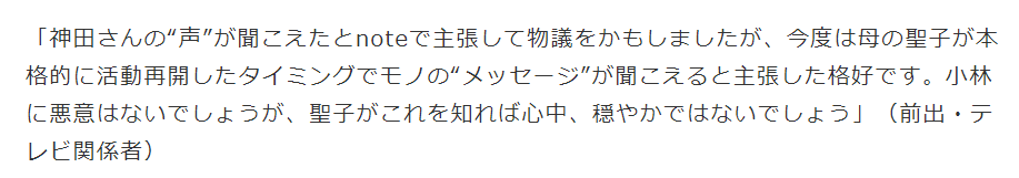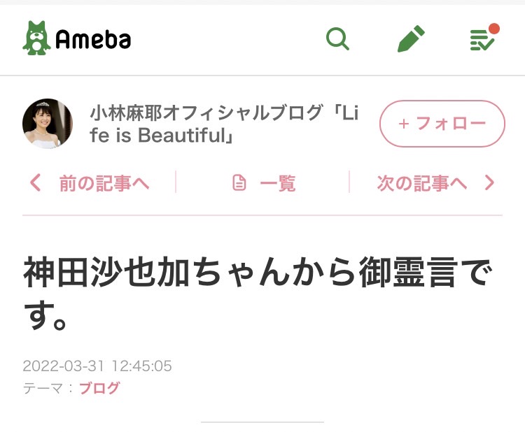 小林さんは、昨年亡くなった神田沙也加さんが“降臨”したと自身のブログで主張しており「神田沙也加です。まさかお話でき(ママ)なんて嬉しい!!!!!!!麻耶さんありがとうございます。麻耶さんがお話を伝え(ママ)くれるってこちらではすごく有名で私もすぐにコンタクト取らせてもらったんです」などと投稿していました。