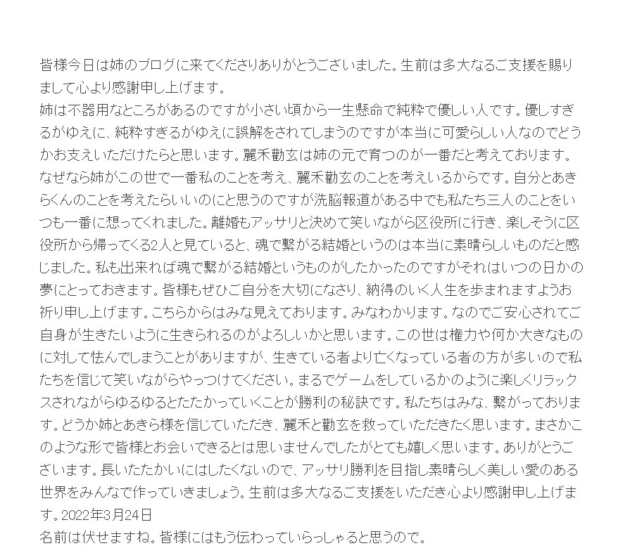 ブログには「皆様今日は姉のブログに来てくださりありがとうございました。生前は多大なるご支援を賜りまして心より感謝申し上げます」と綴られており、2017年に亡くなった妹の小林麻央さんから“預かった手紙”かのような文章で、麻央さんがアメブロを通じて読者に訴えかけているかのような内容となっています。