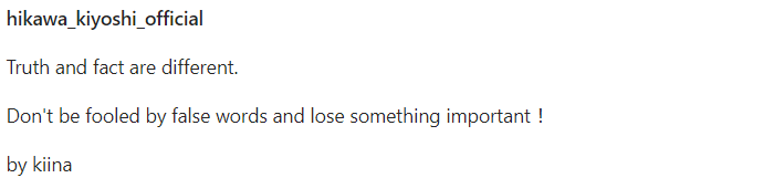 その投稿で、「真実と事実は異なります 虚偽の言葉にだまされて重要なものを失ってはいけません」と英文でつづっており、文末に「by kiina」と記されています。