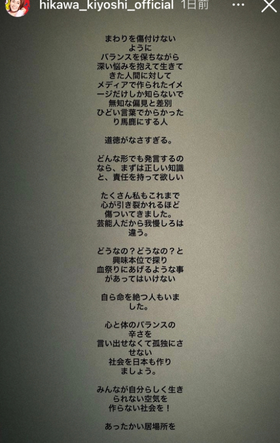 先日もストーリーズに長文をアップした氷川さん。今後もこのように自身の気持ちを発信していくのでしょう。