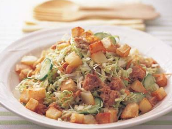 もうひとつのおすすめの献立はおかずサラダです。これは、サラダなんだけどボリュームがあっておかずの一品になるものです。具体的には、サラダに野菜だけでなく、お肉や豆、チーズや雑穀などを加えます。あとは、お気に入りのドレッシングで和えるだけです。これは、サラダという名前ですが、お米を入れても美味しいんです。特に玄米がおすすめです。玄米は栄養価が高く、それだけで全ての栄養を含んでいると言われるほどのスーパーフードです。これをまとめて炊いておいて、小分けにして冷凍しておくと、サラダの具にもなります。もちろん普通にご飯としても食べられます。サラダの具に使用する時のポイントは、炊いたお米を一度洗うことです。こうすることでさらさらな状態になり、サラダによく合うようになります。サラダにたくさんの具材を入れれば、あとはメインのものを焼いたりするだけで献立は完成です。