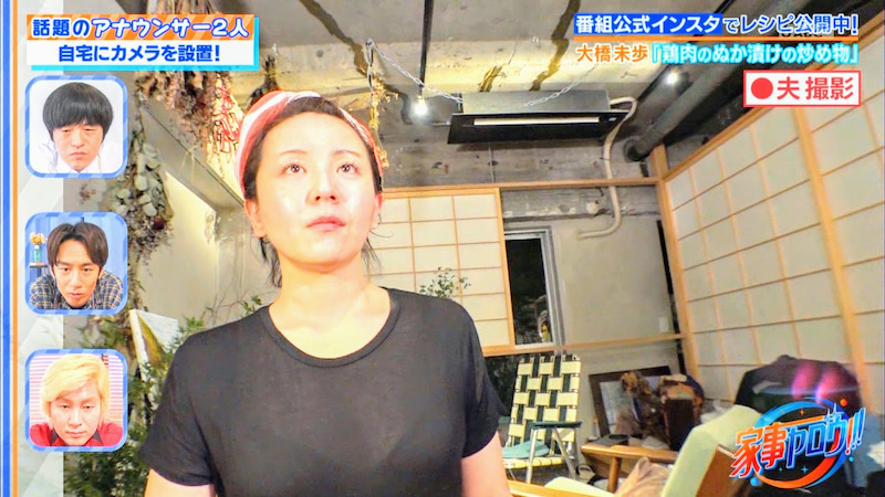 大橋は、「家事ヤロウ」で自宅キッチンでの料理姿を披露し、ほぼスッピンで、ビールを飲みながら手際よく料理する際、照明の当たり具合によって黒Tシャツの下に着用した黒いアンダーウェアが透けて見え、男性視聴者を大喜びさせていました。