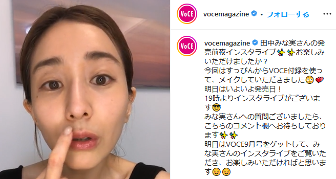 美容雑誌『VOCE』のインスタグラムでは堂々のすっぴん動画を披露しました。