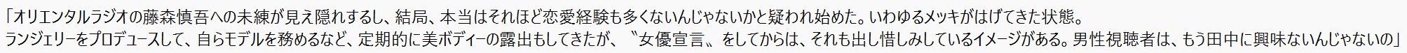 就寝時のノーパン発言は、男性視聴者向けのサービスの意味合いも含まれていると思われますが、それとは裏腹に最近田中がバラエティー番組などで発している「上から目線の恋愛観」にドン引きする男性が続出しているほどです。