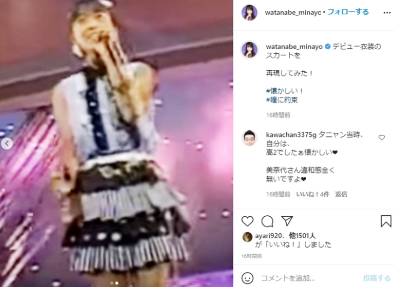 渡辺さんは、「懐かしい!」と思い出に浸りながら、同じデザインのミニスカ衣装でステージに立つ10代当時の写真も公開しました。