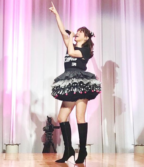 1986年リリースのデビューシングル「瞳に約束」の衣装を再現したそうで、10代で履いていたミニスカを52歳を目前にして難なく着こなしています。