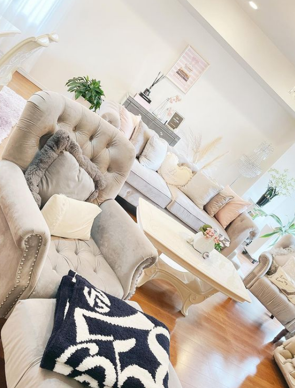 渡辺さんは「朝のリビング #簡単にお掃除 #リビング #お気に入りソファー席 #あまり座る事ないけど。。。」とコメントし、たくさんのクッションが乗せられたソファーや家具と、オフホワイトに整えられた広いリビングの写真を投稿しました。オットマンには「374(みなよ)」と描かれた毛布も。