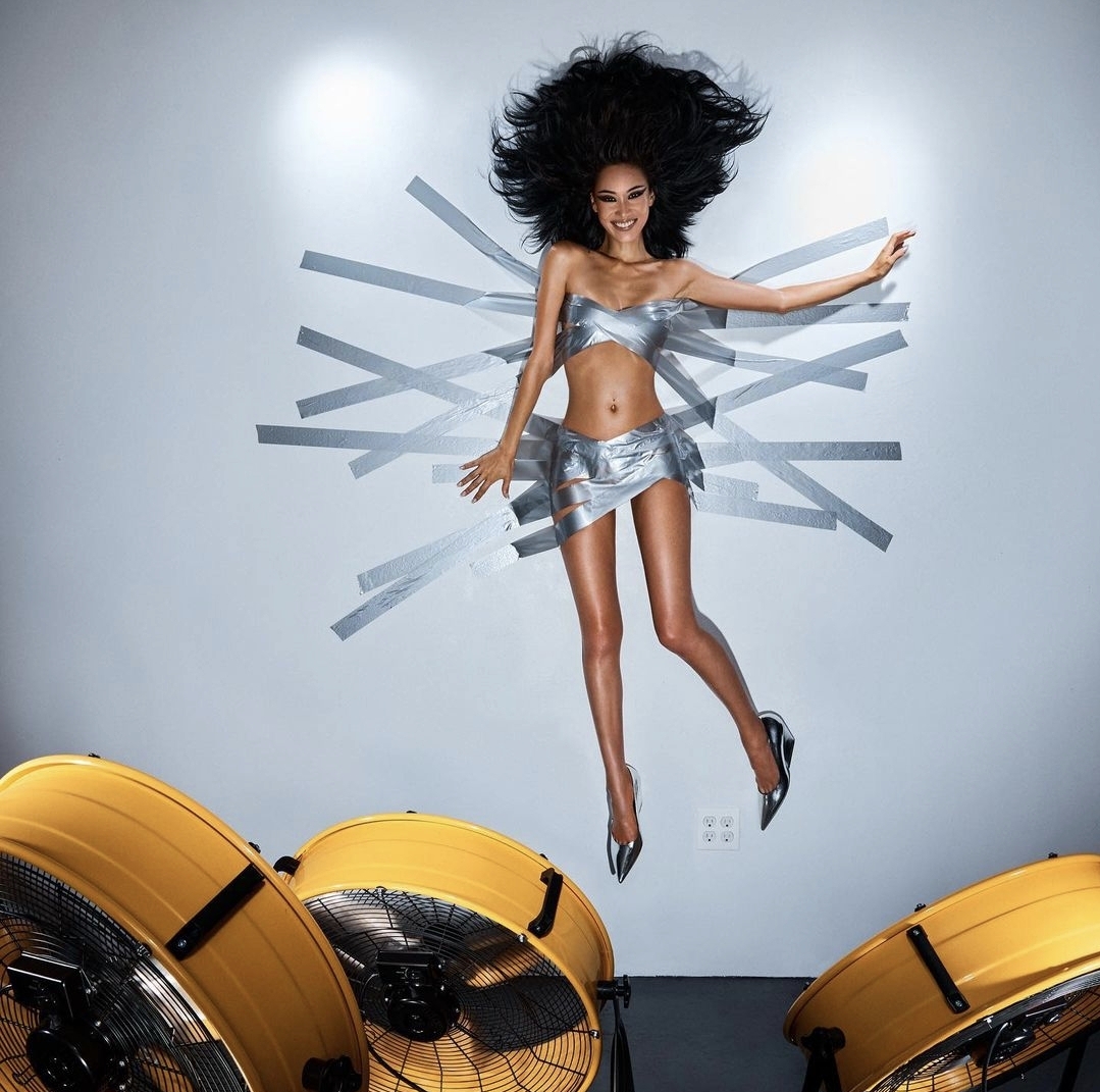 水原は「Blow Ya Mind I LOVE AMERICA」とつづり、1枚の写真を投稿。銀色のテープを胸元と股間に貼り、手前には大きな扇風機が3つ並ぶ独創的なモデルショットを披露しました。長い髪と抜群のスタイルが目を引く全身ショットを披露した水原。白い照明と背景がエキゾチックな印象の褐色の肌を際立たせています。
