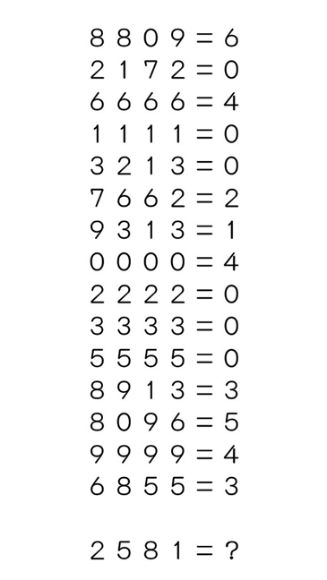 この問題は「8809=6」「2172=0」「6666=4」「1111=0」「3213=0」「7662=2」「9313=1」……などと、ある一定の法則で数式が続く中、「2581=?」の “?” に当てはまる数字を導き出すというものになっています。
