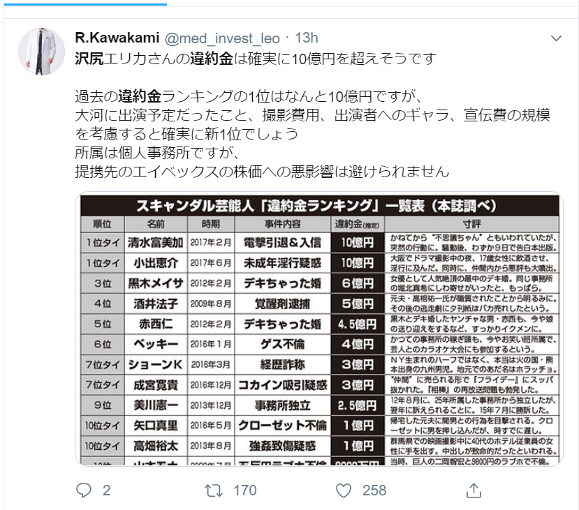 今、注目を集めているのが巨額違約金の行方です。求人情報の検索サイト「Indeed(インディード)」や柔軟剤「レノアハピネス」など5本のCMに出演しており、各社、差し替えなどの対応に追われました。NHK大河ドラマ「麒麟がくる」の10話分の撮り直しにCMの違約金など、沢尻エリカ容疑者の負担額は5億円とも10億円とも報じられています。