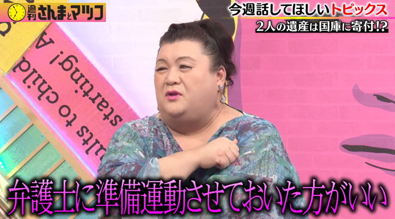 また、マツコさんは「私は子どもいないからさ」としつつ、「何か一筆書いておかなきゃ。(遺産が)遠い親戚とかに渡ることになっちゃうかも。死ぬなってなったらどこかに有効に(つかってほしい)」とコメント。