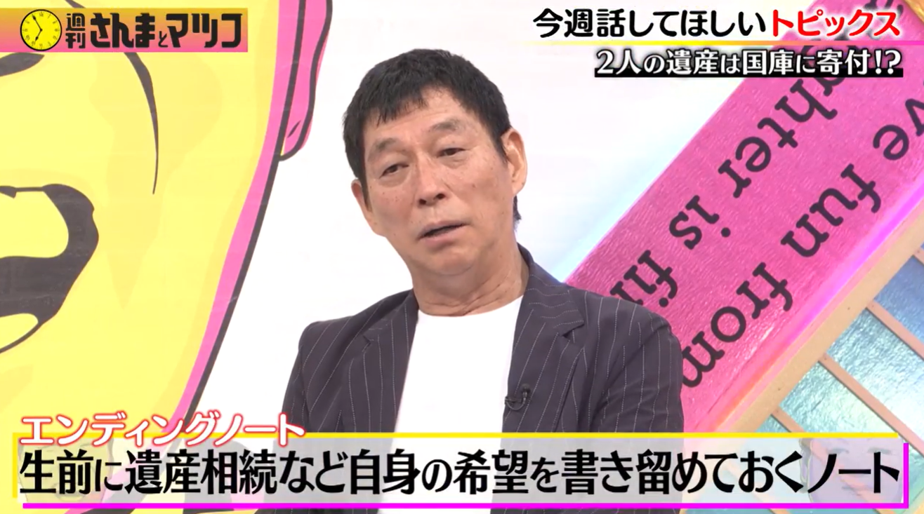 さらに「俺もマツコも今持っているお金を全部、国に寄付しようとしてんねん」と共演のマツコ・デラックスさんも同じ考えだということも激白。さんまさん曰く、息子や娘に財産を残したところで「ロクなことにならへん」と話し、自宅については「終了帳(エンディングノート)っていうのか、そういうのを残して子供たちにあげたい」と希望を語っていました。