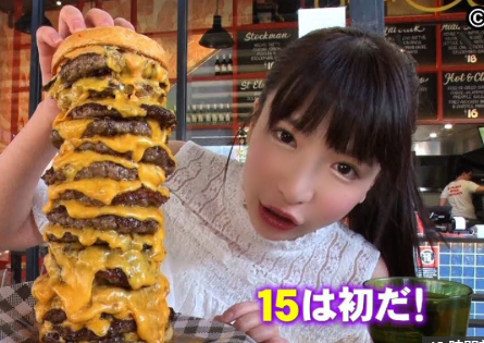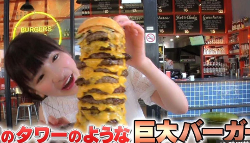 もえあずは総重量2キロ、パテ15枚を挟んで豪快に立てた巨大ハンバーガーを、相手がギブアップするまで無限に食べる続けるルールで対戦に挑みました。相手は同国では有名なフードファイター、ジェシー・フリーマン氏。「ギネス記録保持者」だといいます。