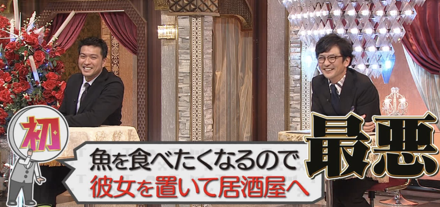 「水族館行ったらあんま見なくていいんです。入り口で待ってるんで見ておいでって、俺はもうそれ見てると蟹とか食べたくなっちゃうんで、お酒飲みたくなっちゃうんですよ、水族館で…。『先行ってるね』って言って居酒屋待ってるっていう」と彼女一人で水族館に行かせるというプランを計画。