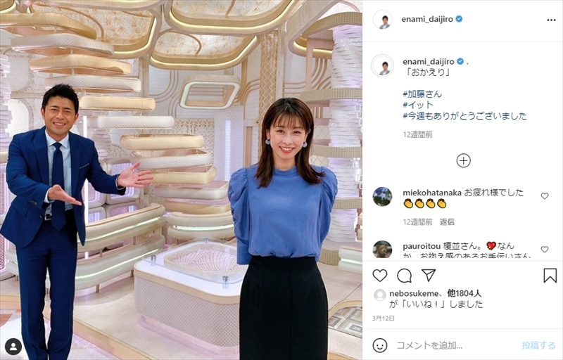 「皆さんにおめでとうと声をかけていただいて、少しずつ実感がわいてきました」とこの祝福に満面の笑顔で 答えていました。さらに同期の榎並大二郎アナからも「めでたいですね」と言われると、両手で顔をおおって照れた様子でしたが…。