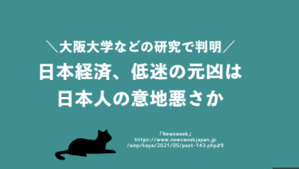 同日、「ニューズウィーク」が配信した「日本経済、低迷の元凶は日本人の意地悪さか 大阪大学などの研究で判明」とのタイトルの記事を引用してツイートした前澤氏。