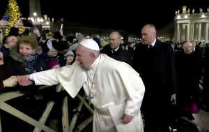 教皇が広場でキリスト生誕の場面の模型を鑑賞し、集まった信者らの前を歩きながらあいさつしていた時に そのハプニングがおこりました。 一人の女性が突然、教皇の手をつかんで引っ張り、はなそうとしなかったため、なんと教皇は 女性の手をたたいて、ふりほどいたというのです!
