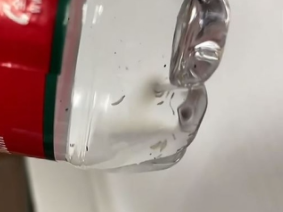 公開された映像の中のミネラルウォーターは開封されていない新品で、白と黒の異物が見え、その黒い異物が虫の卵であると主張しました。
