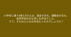 ”小学校に通うA君とBさんは、遠足の日も、運動会の日も、自然学校の日も同じお弁当でした。” 問題文をちゃんと読まないと解けない問題 今回ご紹介するのは脳トレクイズです。 問題 小学校に通うA君とBさんは、遠足の日も、運動会の日も、自然学校の日も同じお弁当でした。 さて、それはどんなお弁当だったのでしょうか? Google ADVERTISEMENT Google あなたはわかりましたか? それでは答え合わせに行きましょう! Google 答えは、、、「サンドイッチ」 ADVERTISEMENT お弁当が「三度一致」したので、「サンドイッチ」が答えになります。 Google あなたは間違えずに解けたでしょうか! ADVERTISEMENT Google [著作権者VONVON /無断コピー、無断転載および再配布禁止(違反時の法的措置)