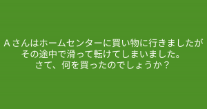 「Aさんはホームセンターに買い物に行きましたが、その途中で滑って転けてしまいました。」意外と難問なクイズに挑戦してみましょう! 今回ご紹介するのは脳トレクイズです。 問題 : Aさんはホームセンターに買い物に行きましたが、その途中で滑って転けてしまいました。 さて、何を買ったのでしょうか? Google ADVERTISEMENT Google あなたはわかりましたか? それでは答え合わせに行きましょう! Google 答えは、、、「板買った(痛かった)」 ADVERTISEMENT 滑って転けて「痛かった」だけに、Aさんは「板買った(痛かった)」のです。 Google あなたは間違えずに解けたでしょうか! ADVERTISEMENT Google [著作権者VONVON /無断コピー、無断転載および再配布禁止(違反時の法的措置)
