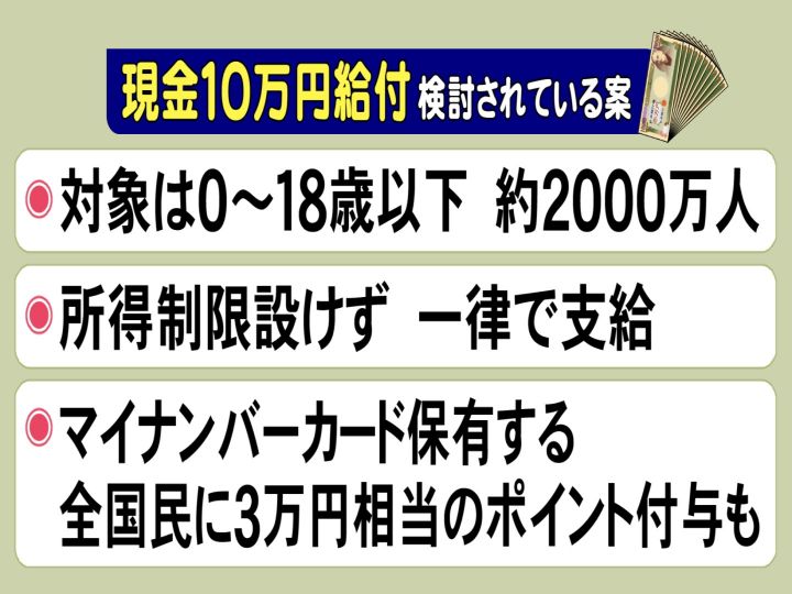 対策の柱として調整する”18歳以下の子どもへの一律10万円の給付“の在り方が焦点となります。18歳以下の子どもへの10万円給付を巡って、公明党が先の衆院選で公約に掲げ、一律10万円を主張していました。政府内では所得制限を設け、富裕層への支給を除く意見もあります。