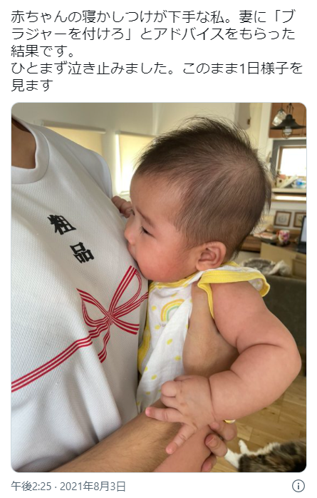 その後もブラジャーのおかげか夜泣きすることもなく、ぐっすり寝てくれたそうで、「しばらくブラジャー生活が確定しました。応援ありがとうございます」と報告しています。
