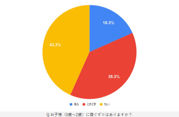 約20%の赤ちゃんが寝ぐずりをすると回答。そして、ときどきという人と合わせると、60%くらいの人が寝ぐずりに悩まされていることがわかります。仲間は意外と多いことに安心するママ・パパも多いのでは?