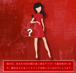 道を歩いてたあなた、偶然体全身を赤に染めた女性を見かけます。