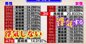 第1弾「性生活の満足度」に続いて公開された検証動画の第2弾。男女ともに浮気率が最も高かったのは埼玉県という結果だったのですが、今回動画で検証したのは「長崎県」。その理由は長崎県の浮気率に男女間で大きな差があったためだそうです。男性は全国で47位と最も浮気をしていないのに対して、なんと女性は第3位という結果が出ていました。