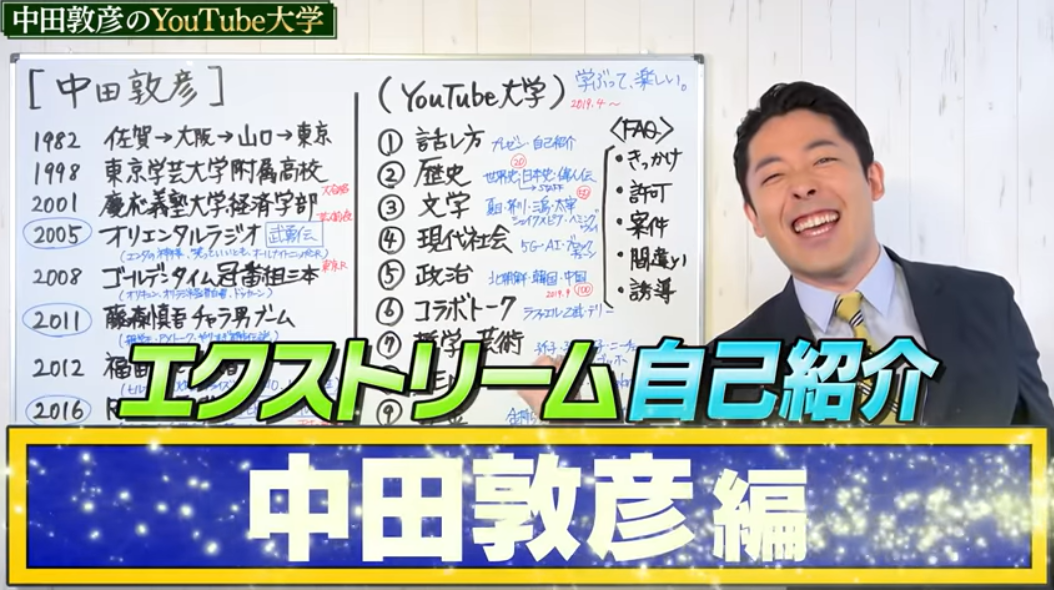 “教育系YouTuber”としても活動する中田さん。昨年いっぱいで所属していた吉本興業を退社し、今年の3月からシンガポールに移住しています。YouTubeメインチャンネル「中田敦彦のYouTube大学」はテンポのいい喋りとわかりやすい説明で、登録者数370万人(2021年3月13日現在)と大好評。