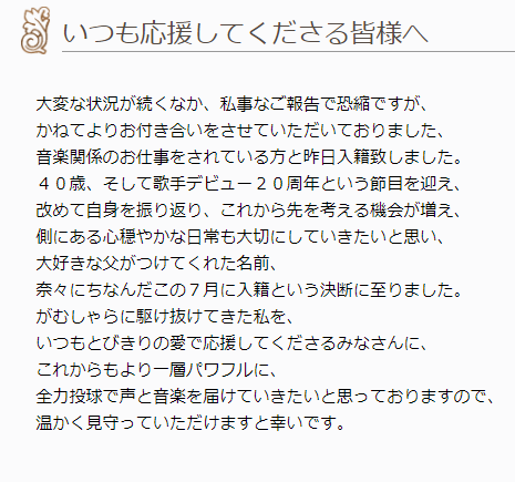 40歳、そして歌手デビュー20周年という節目を迎え、改めて自身を振り返り、これから先を考える機会が増え、側にある心穏やかな日常も大切にしていきたいと思い、大好きな父がつけてくれた名前、奈々にちなんだこの7月に入籍という決断に至りました。