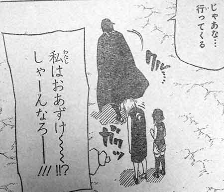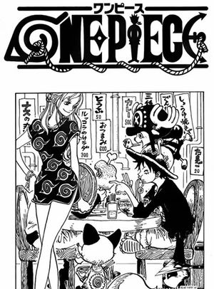 こちらはナルトの最終回が掲載された号のワンピースの表紙です。ナルトに関するメッセージが込められていることはわかりますか? ナルトの好物である一楽ラーメンを食べてる机の向かいで、ナミに隠れてルフィの好物の骨付き肉を食べているのです。タイトルロゴやキャラクターの洋服もナルトっぽいし、ページ一面にナルトを意識した絵柄が描かれていますね。