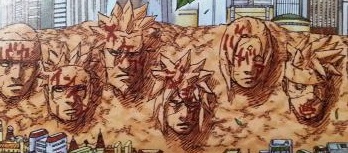 こちらの画像はボルトのいたずら書きです。左から初代柱間「バカ」、二代目扉間「インケン」、三代目ヒルゼン「スケベ」、四代目ミナト「ジジイ」、五代目綱手「ババア」、六代目カカシは口のところを塗っています。