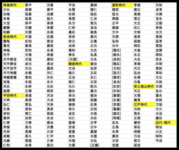 元号は、飛鳥時代の「大化」(西暦645年)から現在の「平成」まで231個が存在しています。
