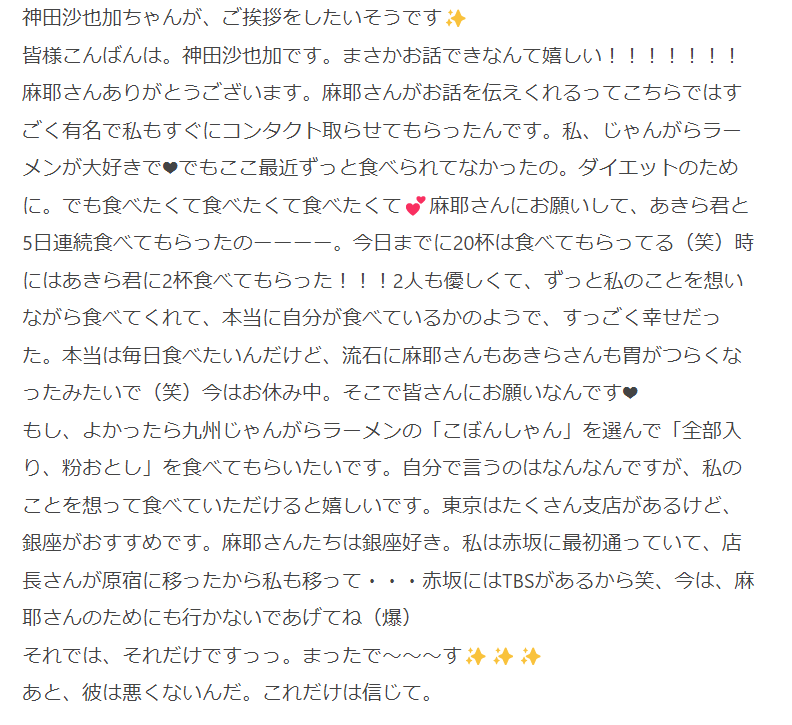 神田さんが大好きだった”九州じゃんがらラーメン”を麻耶さんと夫の國光さんにお願いして、、、という内容になっています。麻耶さん夫婦の体を神田さんに貸しているということを示唆できるような内容に、ネット上では