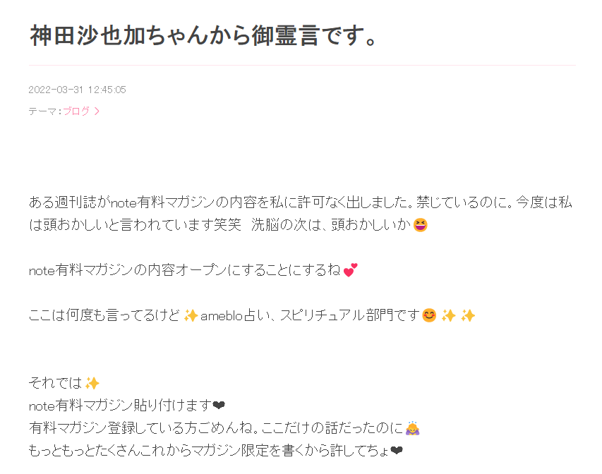 さらに先月31日、文春オンラインの報道を受けた麻耶さんは「神田沙也加ちゃんからの御霊言」と題された記事をブログにまで公開したのでした。その内容というのが、、、