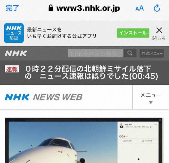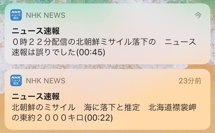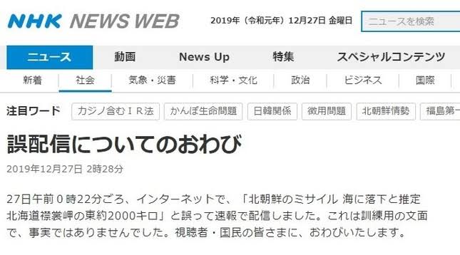 今月12月27日の午前0時頃、NHKはオンライン版で「北朝鮮のミサイル 海に落下と推定 北海道襟裳岬の東約2000キロ」という速報を報道しました。しかし、その記事が公開されたすぐ後に速報を削除し、また、0時45分ごろ「訓練用の文章で、事実とは異なる」と誤報であったと説明しました。