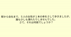 ”誰も少しも濡れたりしませんでした” 問題文のある部分に注目して解いてみましょう 今回ご紹介するのは脳トレクイズです。 問題 駅から会社まで、5人の女性が1本の傘をさして歩きましたが、誰も少しも濡れたりしませんでした。 さて、それは何故でしょうか? Google ADVERTISEMENT Google あなたはわかりましたか? それでは答え合わせに行きましょう! Google 答えは、、、「雨が降っていなかったから」 ADVERTISEMENT 傘は傘でも、日傘をさしていました。 Google あなたは間違えずに解けたでしょうか! Google [著作権者VONVON /無断コピー、無断転載および再配布禁止(違反時の法的措置) ADVERTISEMENT