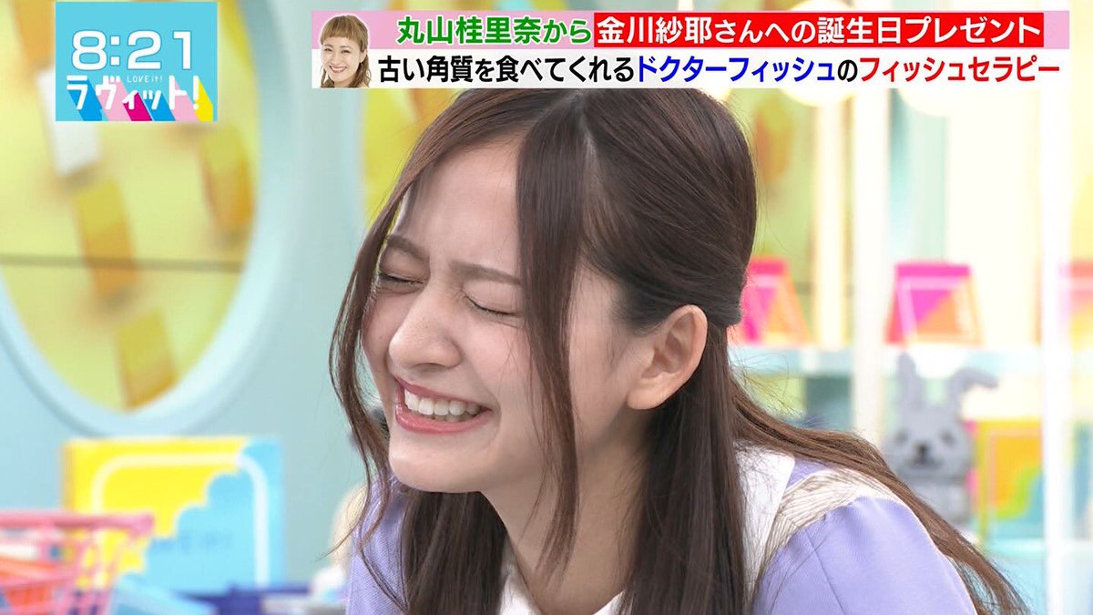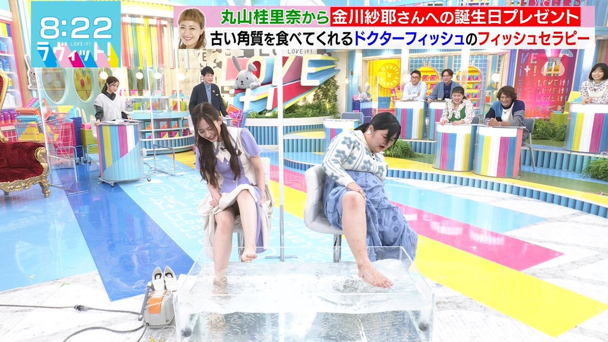 問題のシーンは、丸山桂里奈からのプレゼントシーンでした。丸山は、古い角質を食べてくれるドクターフィッシュのセラピー体験を用意したのですが、なんとその数は1,000匹…あんりと共に靴下を脱ぎ、水槽に足を突っ込んだ金山は、「初めて見ました…」とうじゃうじゃ泳ぐドクターフィッシュに顔をこわばらせます。